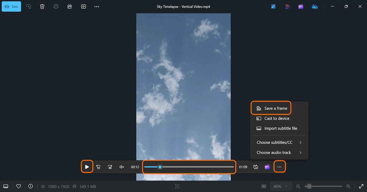 - Using the media controls bar of the Photos app, find the frame of the video you want to capture as a picture and click on the Play / Pause control once you find the frame.